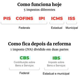 · Simplificar impostos: A reforma quer substituir cinco tributos ( PIS, Confins, e IPI sendo competência federal, e ICMS e ISS de competência estadual e municipal), e substituir pelo imposto sobre Valor Adicionado (IVA).