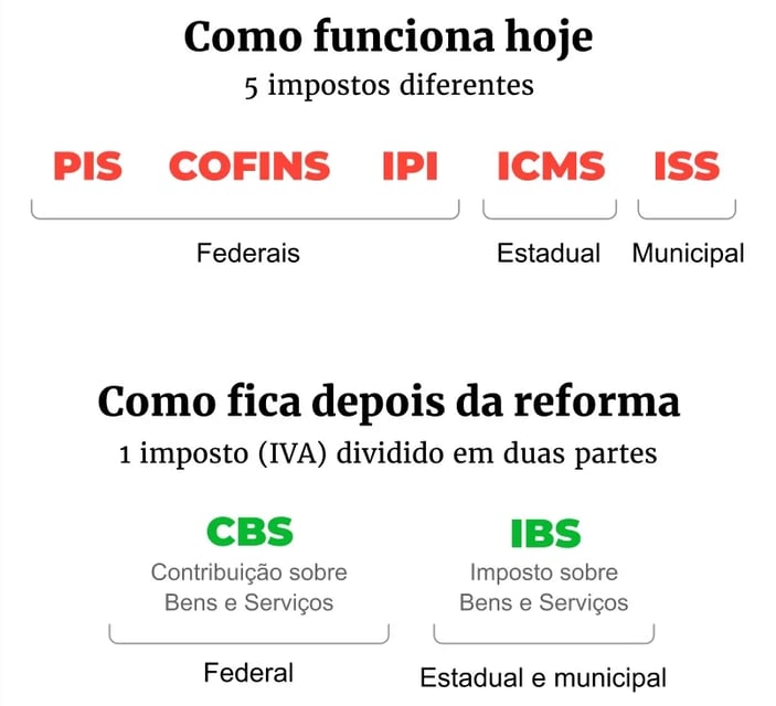 IVA nacional será IVA Dual, dividindo em duas partes, a Contribuição sobre Bens e Serviços (CBS) sendo competência federais, e Imposto sobre Bens e Serviços (IBS) de estados e municípios.