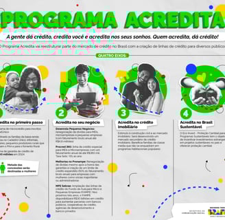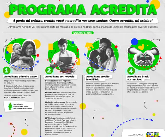 O Governo Federal lançou do dia 22/04/2024 o programa Acredita, para ajudar o empreendedorismo, facilitando crédito e para renegociação de dívidas, com objetivo de gerar renda e empregos.